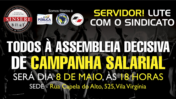 SERVIDOR(A): dia 8 de maio, às 18 horas, vamos realizar mais uma assembleia de Campanha Salarial. Temos que levar ainda mais colegas para este ato legítimo que definirá os próximos passos da luta. Como muitos sabem, os companheiros rejeitaram proposta da Prefeitura em aumentar somente o vale-alimentação e não conceder nenhum reajuste. É HORA DE LUTA. SE UNA AO SINDICATO.