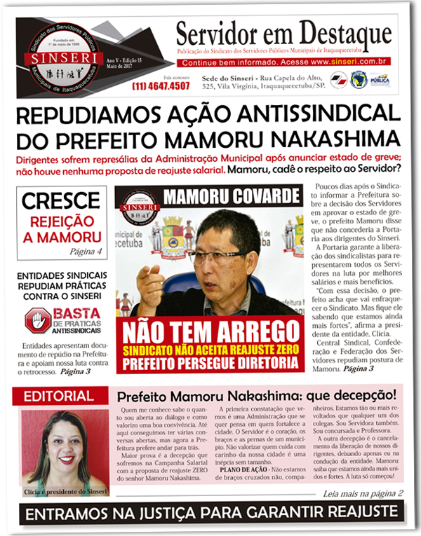 A nova edição do Servidor em Destaque está em circulação desde o final do mês passado. Nosso informativo impresso, que também está disponível em formato PDF, apresenta os principais ganhos dos últimos meses e ressalta a luta do Sinseri contra as injustiças impostas pela Administração, como o caso do nosso reajuste salarial.