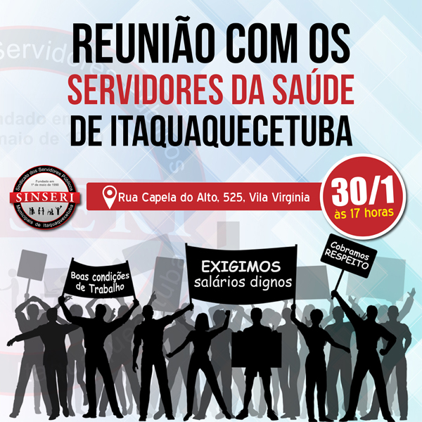 Nosso Sindicato convoca todos os profissionais da Saúde para uma importante reunião, dia 30 de janeiro, às 17 horas, na sede da entidade, que fica na rua Capela do Alto, 525, Vila Virgínia. Vamos ouvir as principais reivindicações dos Servidores, formular uma pauta de reivindicações e definir uma Comissão de Trabalhadores (de até cinco pessoas) para acompanhar reuniões com a Prefeitura e a Saúde.