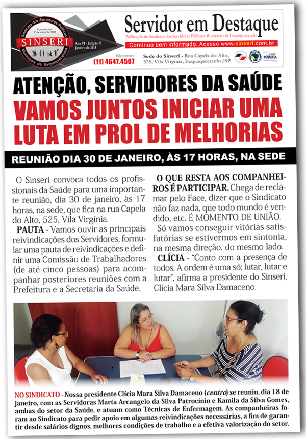 O Sinseri convoca todos os profissionais da Saúde para um encontro que será realizado no dia 30 de janeiro (próxima terça), às 17 horas, em nossa sede, rua Capela do Alto, 525, Vila Virgínia. Para alcançar toda a categoria, a 17ª edição do Servidor em Destaque aborda todos os detalhes do assunto e será entregue na base. É fundamental que todos do setor compareçam para deliberar a pauta de reivindicações e os integrantes que irão compor a Comissão de Servidores.