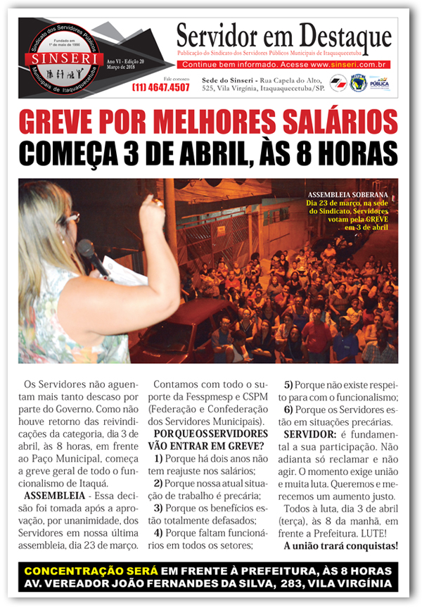 Desde o dia 28 de março, o material digital circula nas redes sociais, WhatsApp e no site da entidade. A versão impressa começará a circular na segunda, dia 2, a partir das 6 da manhã. Além dos Servidores que fazem parte da Comissão de Greve, todos os companheiros podem comparecer ao Sindicato para retirar o informativo. Além do jornal, vamos disponibilizar uma Carta Aberta à população.