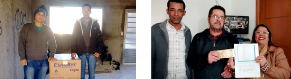 À esquerda, Coy leva fogão na casa de Anderson da Silva; à direita, ganhador da geladeira retira o valor |