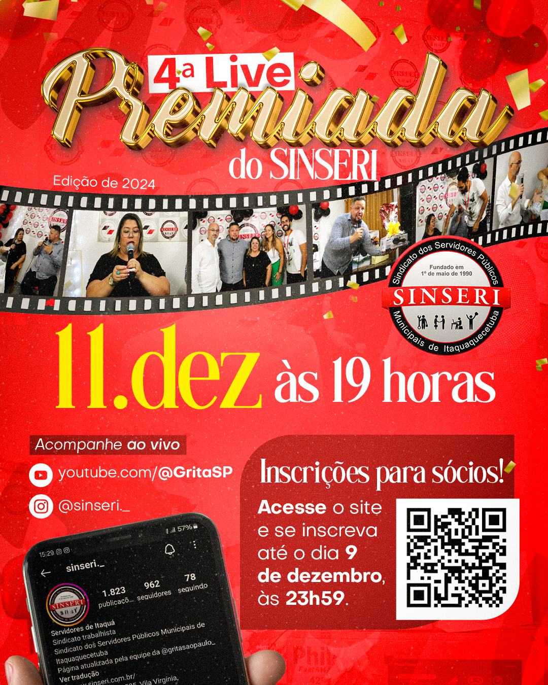 Vamos realizar, dia 11 de dezembro, às 18 horas, a 4ª edição da Live Premiada do Sinseri. A transmissão será AO VIVO pelo Youtube, Facebook e Instagram do Sindicato 😍. Vamos prestar contas das ações e conquistas da entidade durante o ano de 2025 e, além disso, os SERVIDORES ASSOCIADOS que se inscreverem vão concorrer a dezenas de brindes, sendo todos eles sorteados na live. Em breve, divulgaremos as imagens dos presentes.