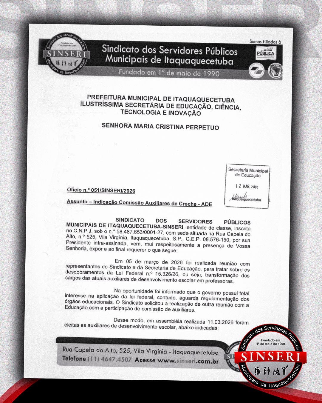 Recapitulamos pontos importantes da Lei nº 15.326/26. Nossa presidente Clícia Mara Silva Damaceno explicou que a gestão demonstrou interesse positivo na implementação da lei, mas aguarda respostas do Ministério da Educação antes de prosseguir. O advogado do Sinseri, Dr. Rafael Ceroni, reforçou que a reunião com a Secretaria de Educação foi produtiva, pois houve recebimento e autorização para continuidade das discussões sobre a alteração prevista na legislação federal. Ele explicou que cada município tem interpretações diferentes sobre a aplicação da lei, e que as Auxiliares são os que se aproximam mais de ter direito à transformação. Dr. também destacou um ponto importante sobre o impacto financeiro que a transformação pode ter, especialmente em relação à lei de um terço.