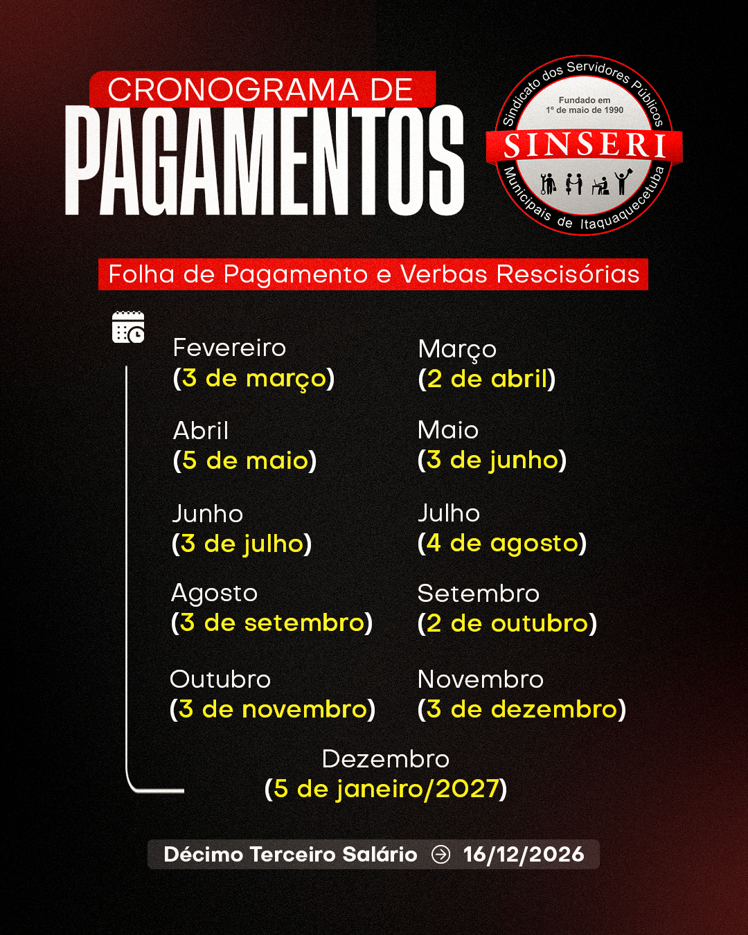 A Prefeitura de Itaquaquecetuba formalizou ao Sindicato o cronograma com as datas previstas para pagamento do salário, verbas rescisórias e do 13º do funcionalismo. Compartilhamos com a categoria para que se programem, pois é importante termos essas datas por conta dos nossos compromissos. Qualquer dúvida, vocês podem acionar o Departamento de Recursos Humanos e o Sinseri permanece sempre à sua disposição.