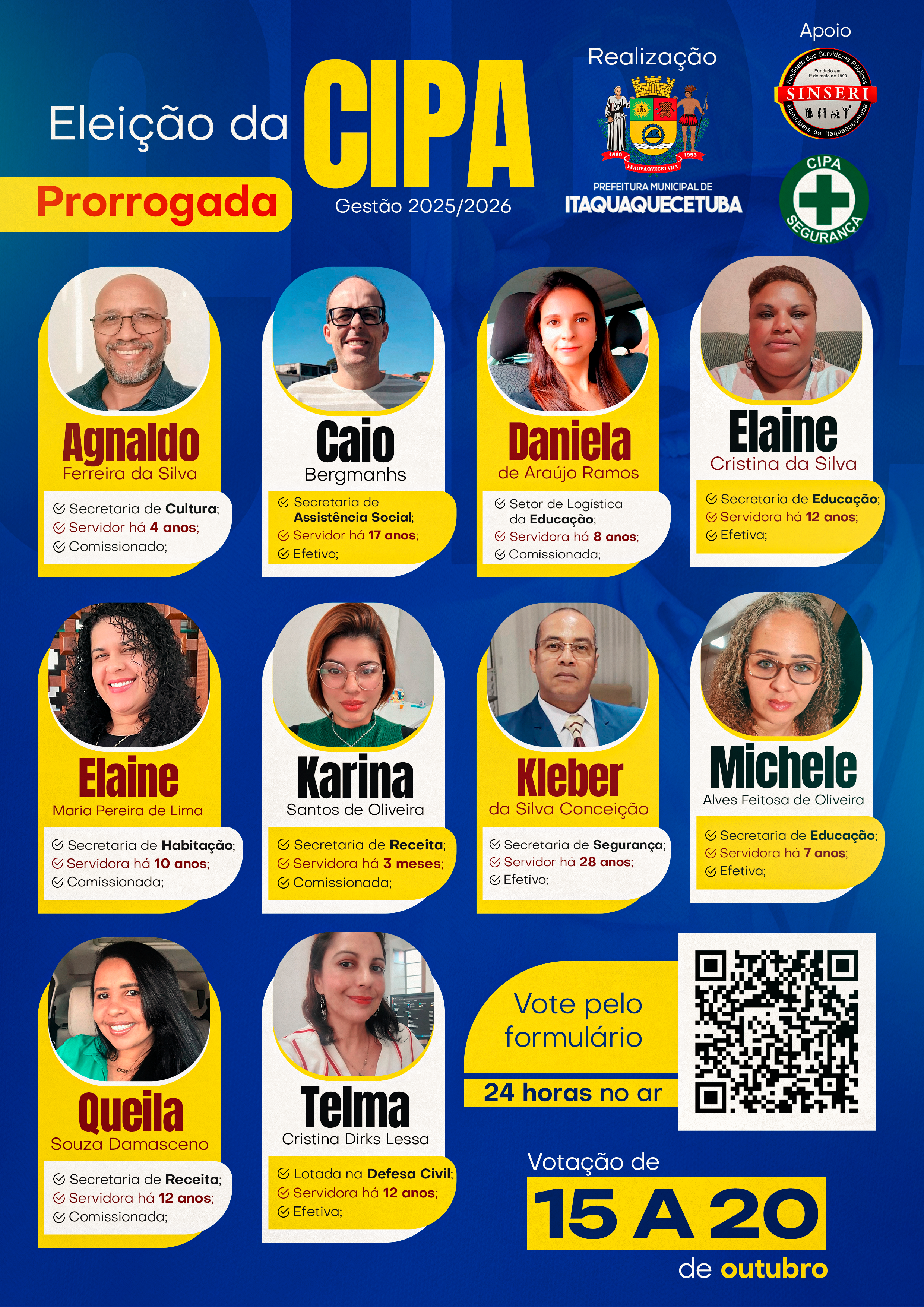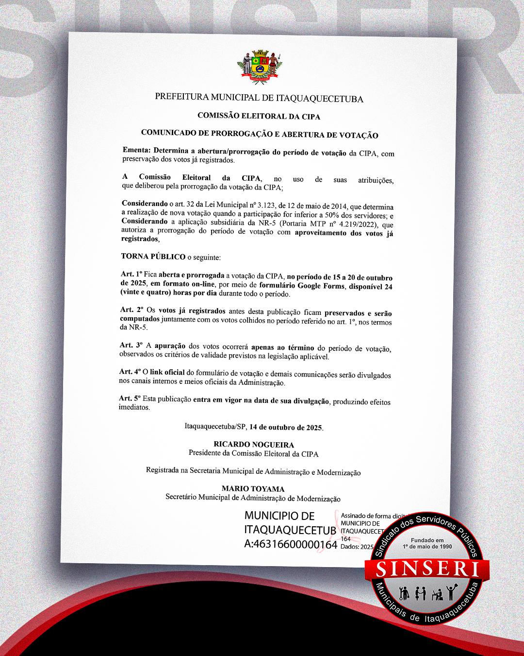 A votação para eleger os membros da Comissão Interna de Prevenção de Acidentes (CIPA) – gestão 2025/2026 foi novamente estendida, conforme comunicado assinado pela presidência da Comissão Eleitoral. Como o pleito anterior não atingiu o quórum necessário, a Prefeitura realizará uma nova votação, que ocorrerá de 15 a 20 de outubro, totalizando seis dias para os Servidores participarem de forma online. Os votos já computados serão mantidos. Caso já tenha participado do pleito na data original, não é necessário votar novamente. Aqueles que ainda não puderam participar terão uma nova oportunidade.