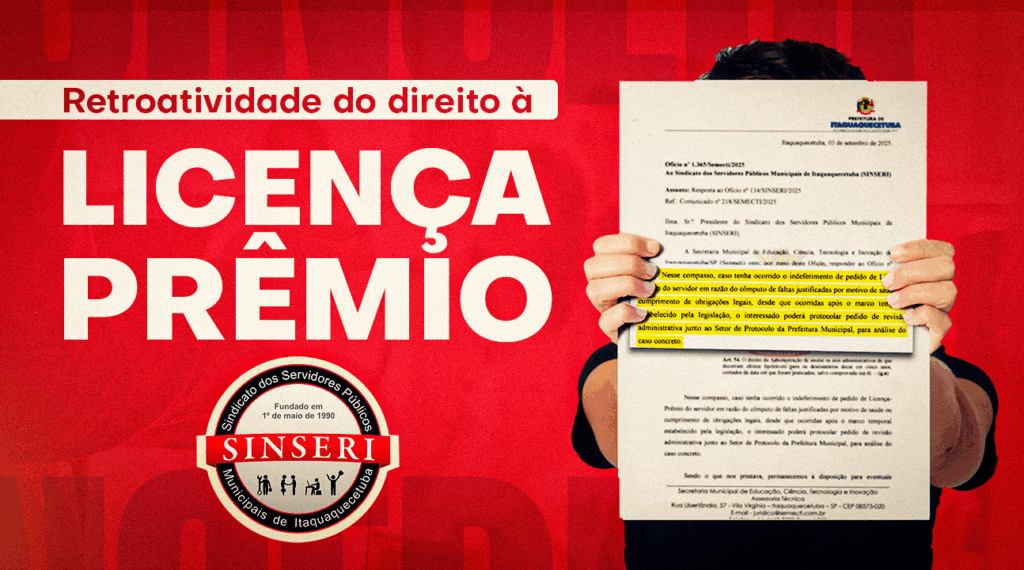 A Secretaria de Educação retornou ao Sindicato sua posição sobre o Ofício nº 134/2025. No documento, solicitamos a aplicação retroativa das novas diretrizes relativas à contagem de faltas justificadas para a concessão da Licença-Prêmio por Assiduidade aos Profissionais do Magistério. Tivemos a CONFIRMAÇÃO de que os Professores podem sim reingressar com pedido, caso tenha sido indeferido, desde que obedeça o prazo de cinco anos, conforme as regras disponíveis na publicação do Comunicado nº 218/SEMECTI/2025.