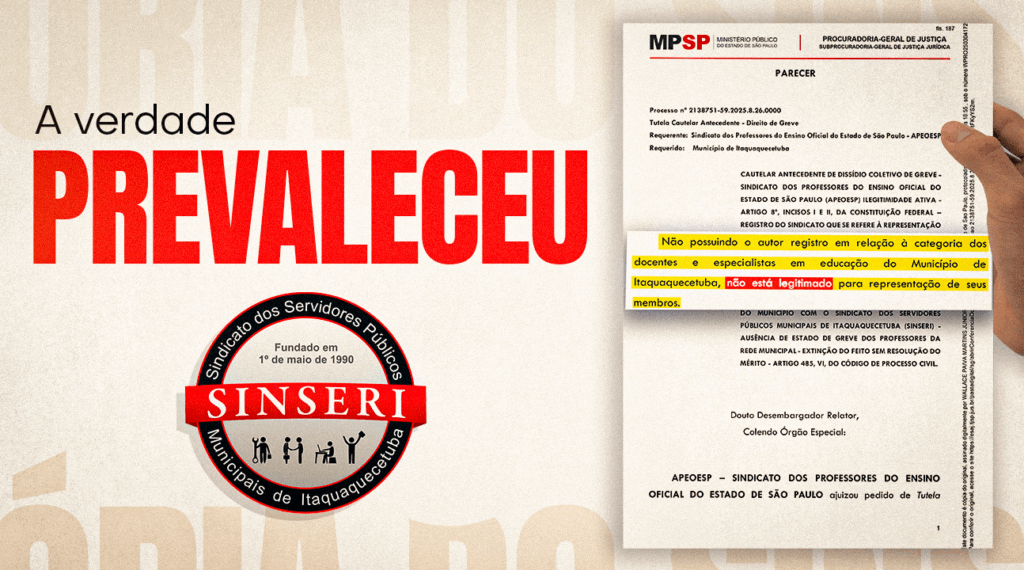 O SINSERI reafirma com segurança: nunca deixamos de dizer a verdade aos Professores municipais. Desde o primeiro momento, alertamos que a APEOESP não tinha qualquer legitimidade para representar o Magistério da rede municipal e, portanto, não poderia convocar ou conduzir uma greve em Itaquaquecetuba.