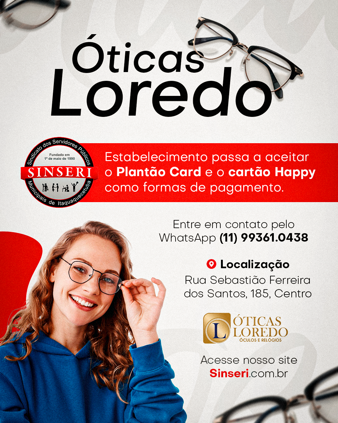 O Sinseri tem uma boa notícia aos Servidores de Itaquaquecetuba! Mais um estabelecimento da cidade passa a aceitar o Plantão Card e o cartão Happy como formas de pagamento. A Ótica Loredo, localizada na rua Sebastião Ferreira dos Santos, 185, Centro, agora disponibiliza ambas as opções aos associados do Sindicato, ampliando as vantagens e facilitando o acesso a óculos de qualidade.