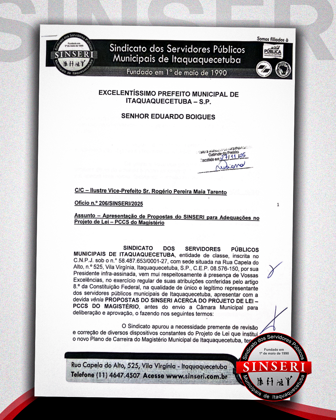 Logo após a avaliação detalhada, o Sinseri protocolou na Prefeitura hoje, dia 27 de novembro, os Ofícios 205 e 206/2025/SINSERI, solicitando a correção de trechos que representam riscos, insegurança jurídica e possíveis retrocessos no PCCS do Magistério.