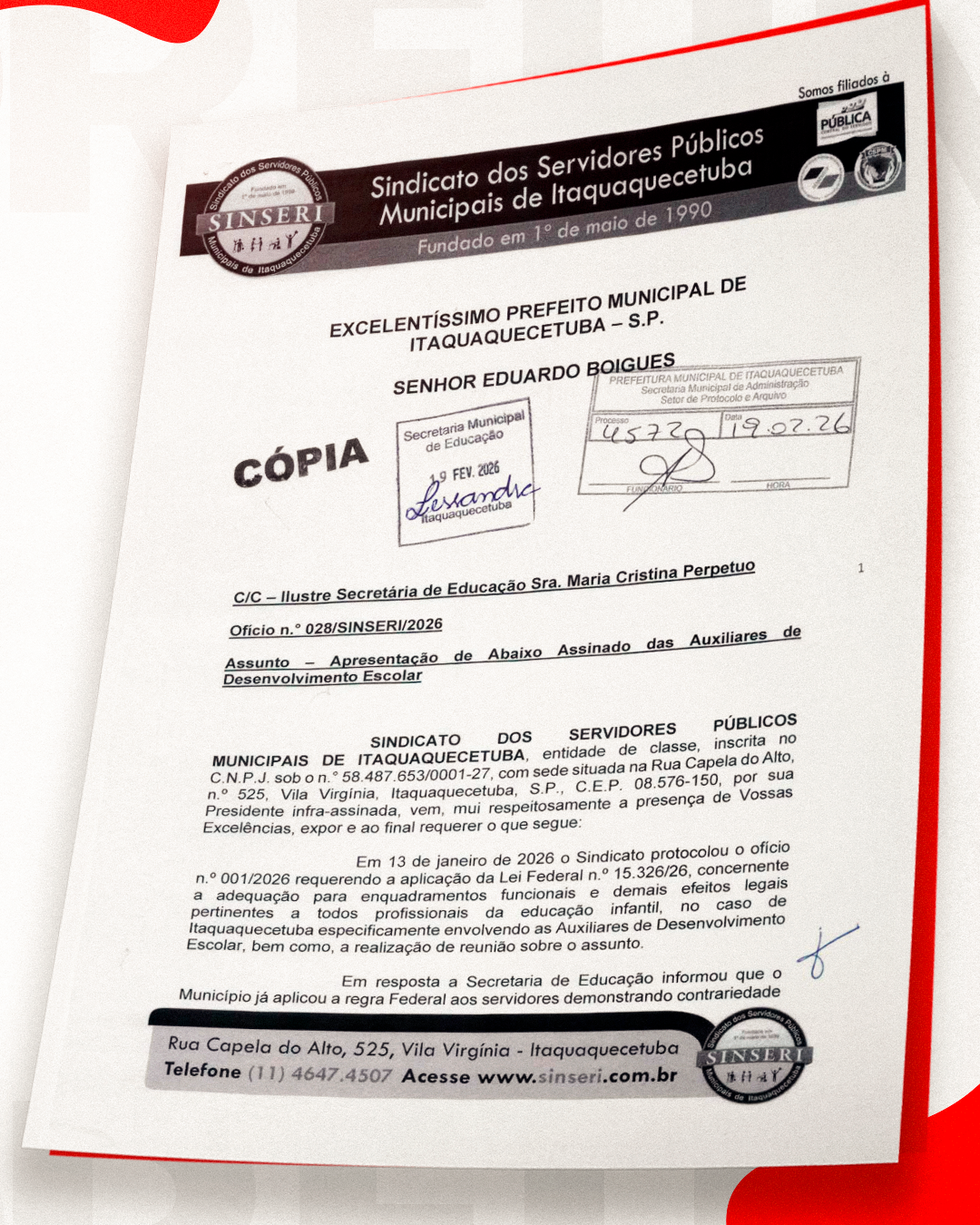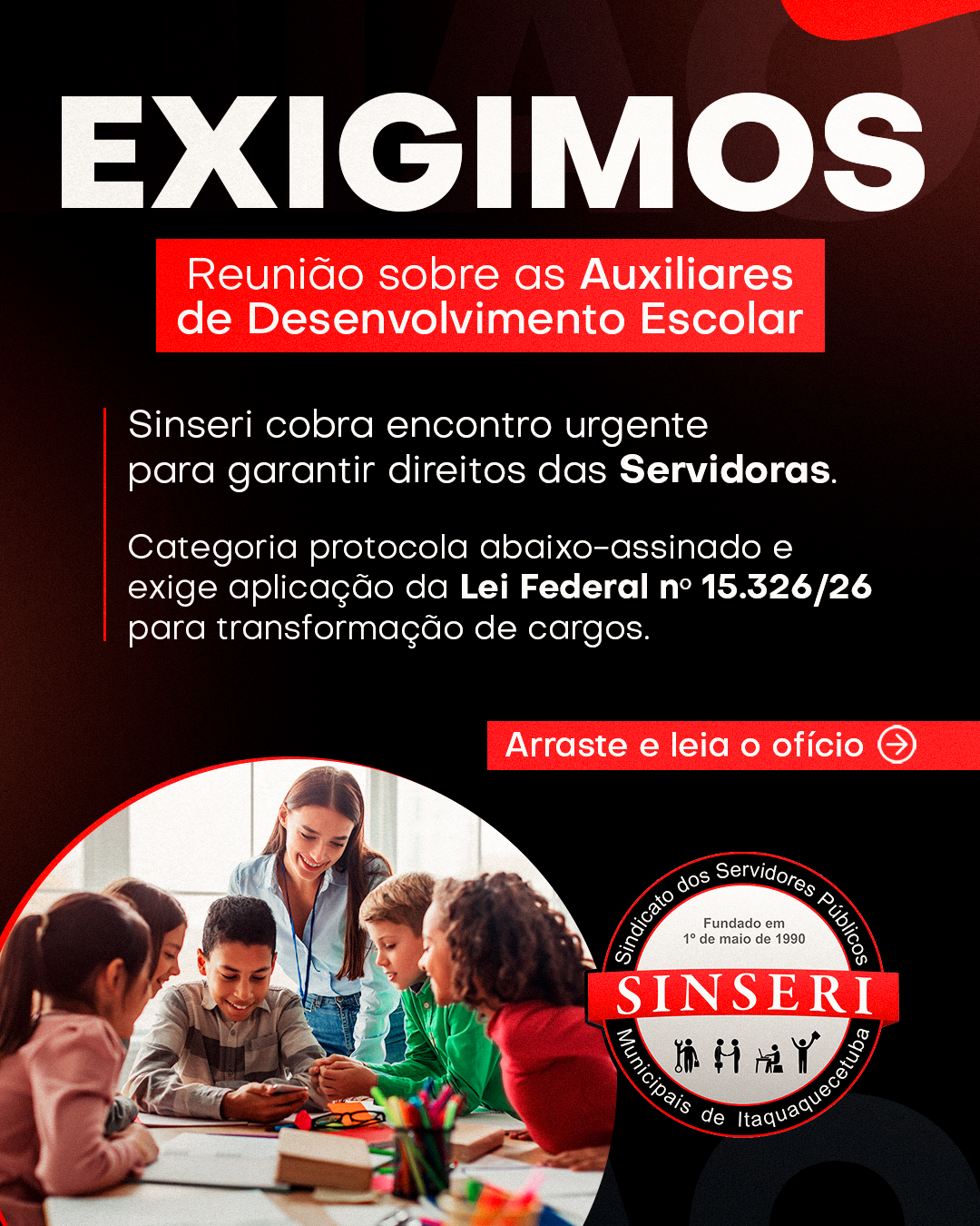 O Sindicato protocolou na última quinta, 19 de fevereiro, um ofício reiterando a necessidade urgente de agendamento de reunião com representantes da Prefeitura e da Secretaria de Educação. O encontro, solicitado desde o início do ano, tem como pauta principal a aplicação da Lei nº 15.326/26 para as Auxiliares de Desenvolvimento Escolar, profissionais que reivindicam a transformação de seus cargos conforme prevê a legislação federal. A categoria, representada pelo Sinseri, busca garantir os enquadramentos funcionais e demais efeitos legais assegurados pela nova regra, que impacta diretamente a carreira e as condições de trabalho desses Servidores.