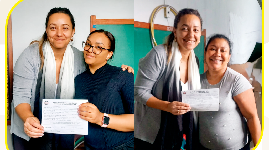 A diretoria do Sinseri dá boas-vindas às companheiras Daniele Pereira Fortunato, Elaine Cristina de Souza e Jaqueline Pereira de Souza, Auxiliares de Desenvolvimento Escolar. As três Servidores escolheram se unir ao Sindicato na quinta, dia 12 de março, e fortalecer a luta coletiva na cidade de Itaquaquecetuba. Agora, elas passam a ter direito a uma série de benefícios exclusivoss, como descontos em clínicas, mercados e lojas diversas, assessoria jurídica e plano funerário gratuitos, entre outros serviços.