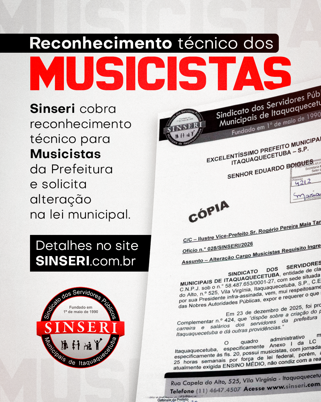 O Sinseri protocolou na última quinta, dia 12 de fevereiro de 2026, o Ofício nº 28/2026 à Prefeitura, solicitando a correção do Anexo I da Lei Complementar nº 424/2025, que estabelece os requisitos de escolaridade para os cargos públicos municipais. Nosso documento solicita que a exigência para Musicistas seja alterada de “Ensino Médio” para “Ensino Técnico”, alinhando-se à realidade da profissão e à jurisprudência já consolidada no judiciário brasileiro.