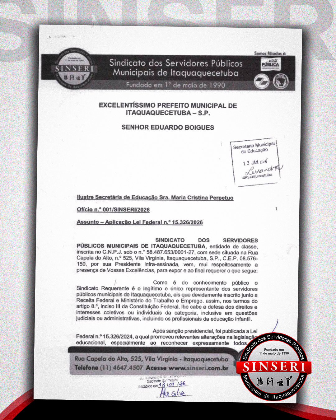 O Sinseri protocolou, nesta terça, 13 de janeiro, ofício junto à Prefeitura e Secretaria de Educação de Itaquaquecetuba requisitando a aplicação imediata da Lei nº 15.326/26. A normativa, recentemente sancionada, reconhece todos os profissionais da Educação Infantil como integrantes do Magistério, alinhando-se aos preceitos constitucionais e à Lei de Diretrizes e Bases da Educação Nacional. A medida visa assegurar direitos históricos e promover a valorização dessa essencial categoria.