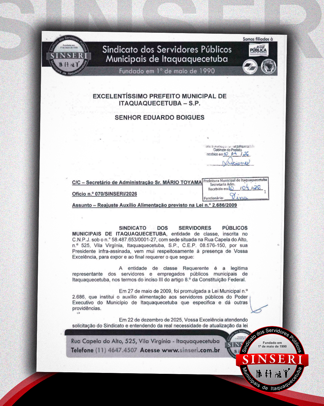 Sinseri protocola pedido de reajuste do auxílio-alimentação para R$ 400 para todos os Servidores de Itaquá